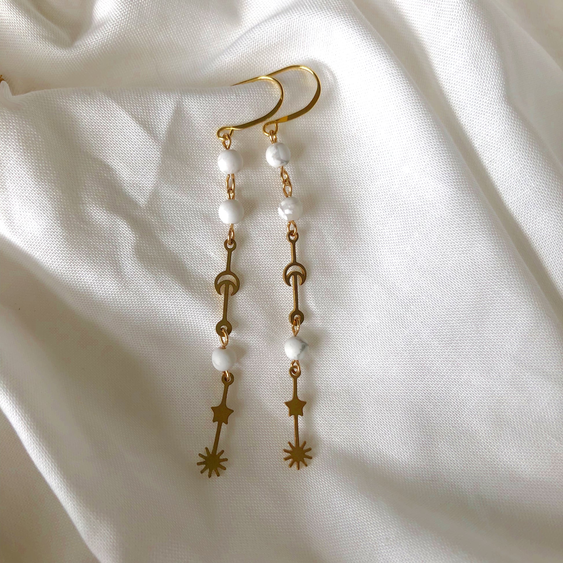 Lightweight earrings | Gold plated sterling silver hooks | Semi precious stones | Brass cosmic charms