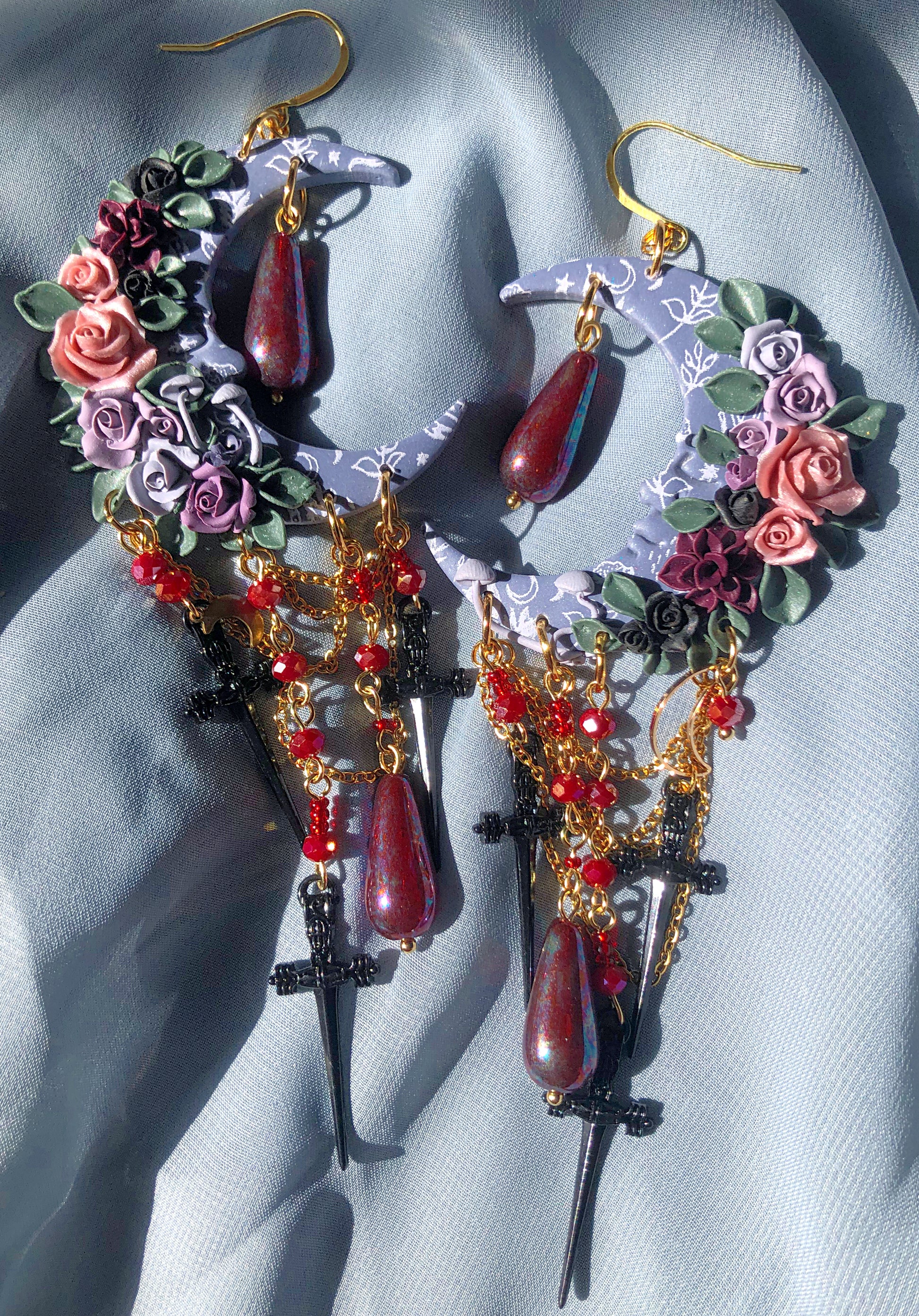 Gold plated sterling silver hooks. Unknown metal black single sided black swords/daggers. Polymer clay moon, polymer clay roses and moth sculpted by hand.
