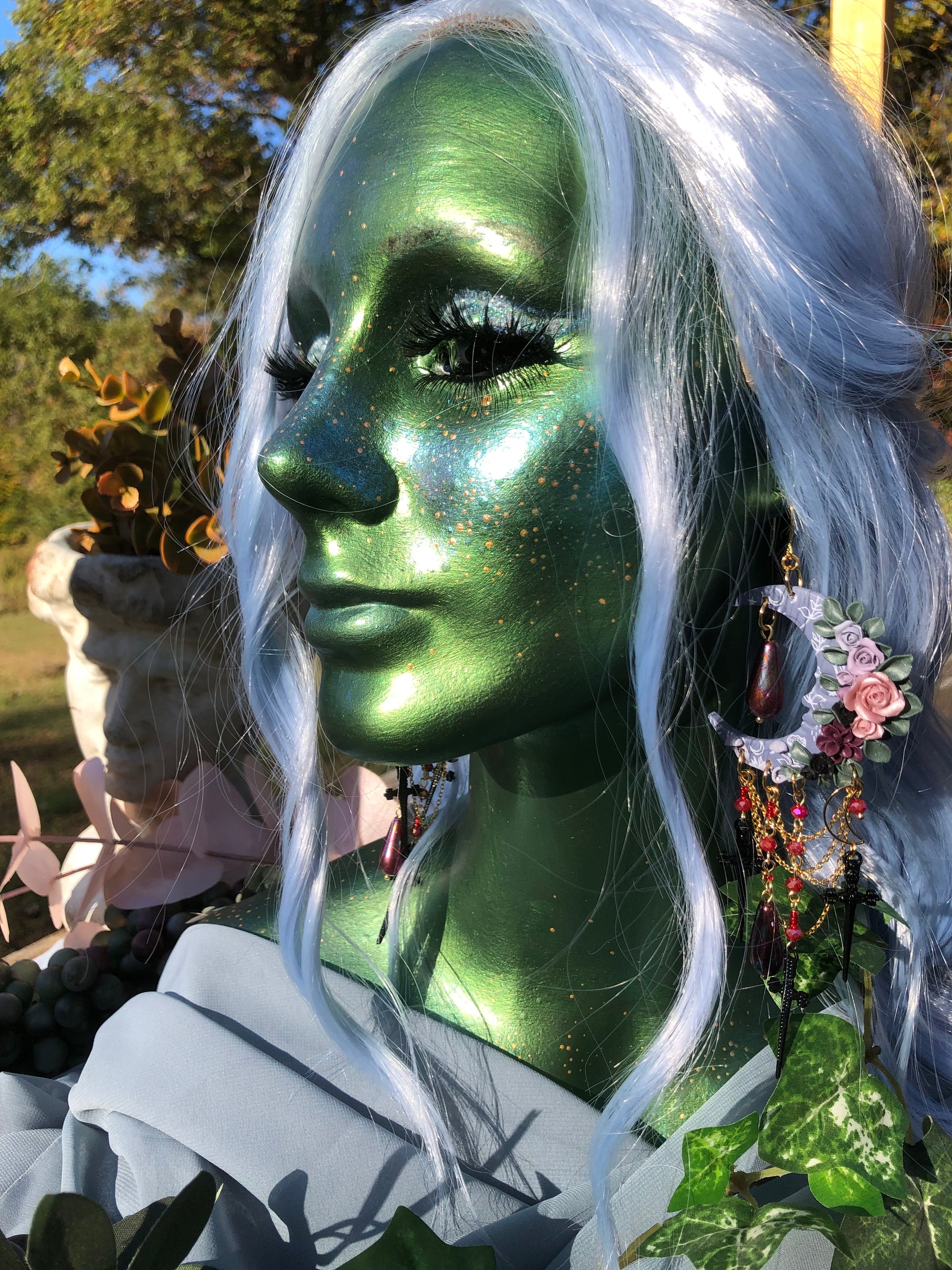 Blue moon representing the color of Maria’s dress when she regained her past life memories as Elisabeta. Various red glass beads/droplets to symbolize the brief, passionate period she spent as a vampire with her love before he sacrificed himself to save her (😭)