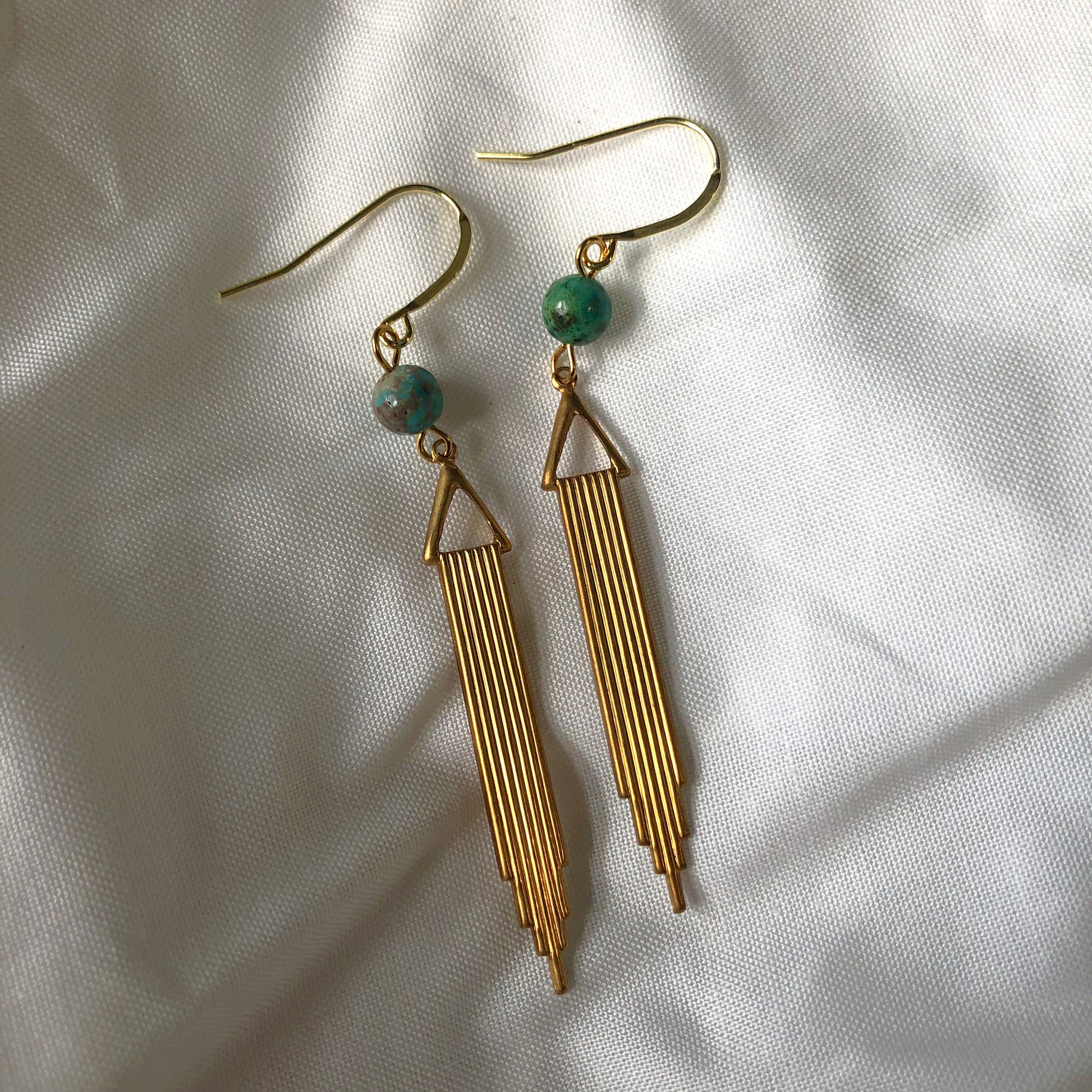 Lightweight statement earrings for everyday, featuring turquoise and vintage brass art deco charms. Gold plated stainless sterling silver hooks.