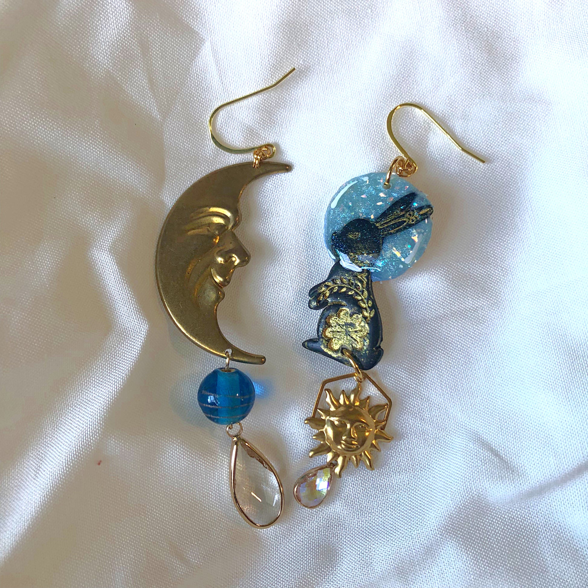 Lightweight statement asymmetrical earrings. Polymer clay space rabbit hand painted by Mable, brass moon, glass beads, and faceted glass droplets that are gold plated in brass. This is the matching bunny to the space bunny necklace released last year. 💙