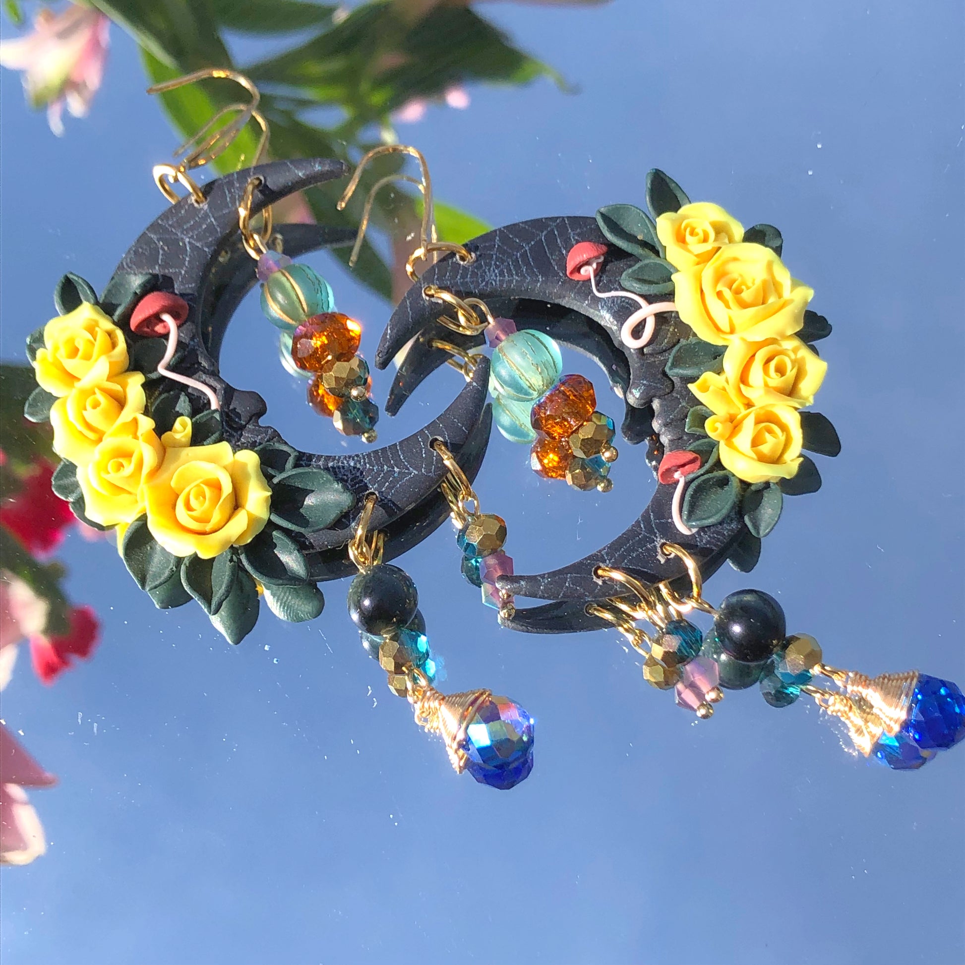 Blue tiger’s eye crystals, accompanied by various jewel toned faceted glass beads. The moons are made of polymer clay with each rose sculpted petal by petal, and screen printed with silvery pearl spiderweb designs.