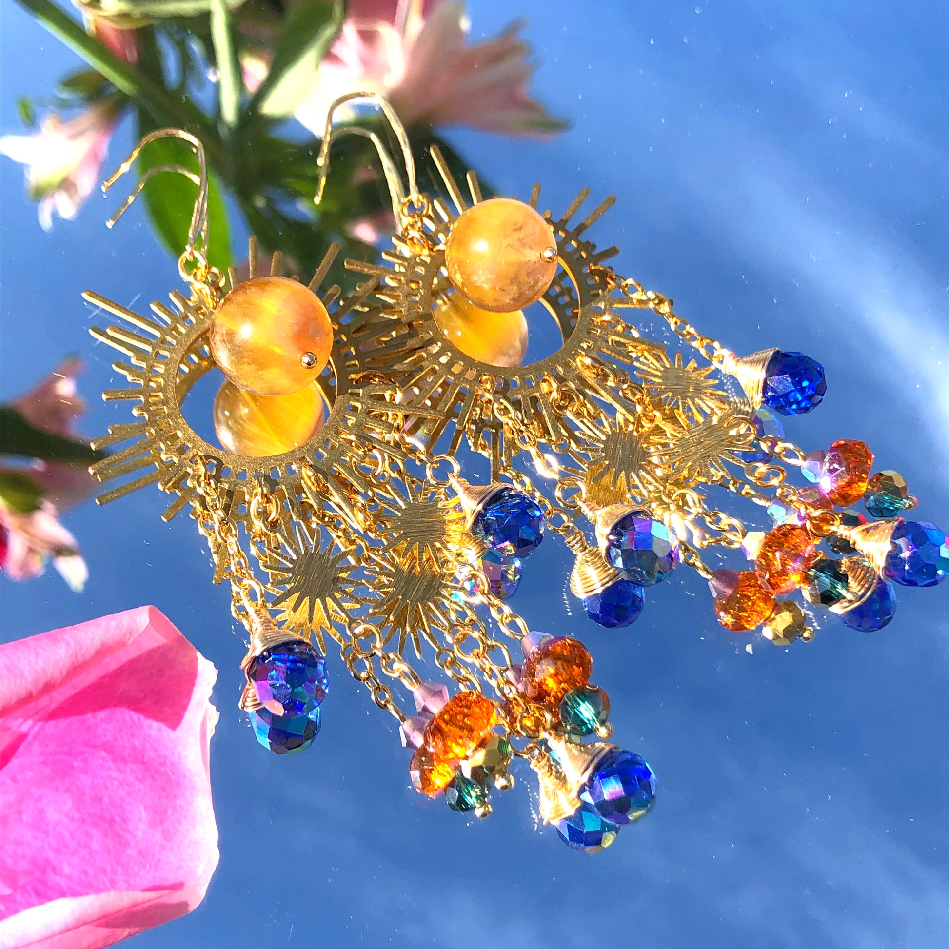 I have two of these so you might not get the *exact* pictured, but all components are the same. :) Yellow fluorite suns with hints of purple, high quality faceted glass beads (cobalt blue, iridescent orange, teal/gold, iridescent purple). Sun charm and star charms are brass and will need to be polished occasionally (if that’s your thing— I personally like the more aged look) :) Gold plated stainless steel chains and jump rings. Cobalt blue faceted teardrops have iridescent sheen on one side and are wire wrapped in tarnish resistant gold wire.