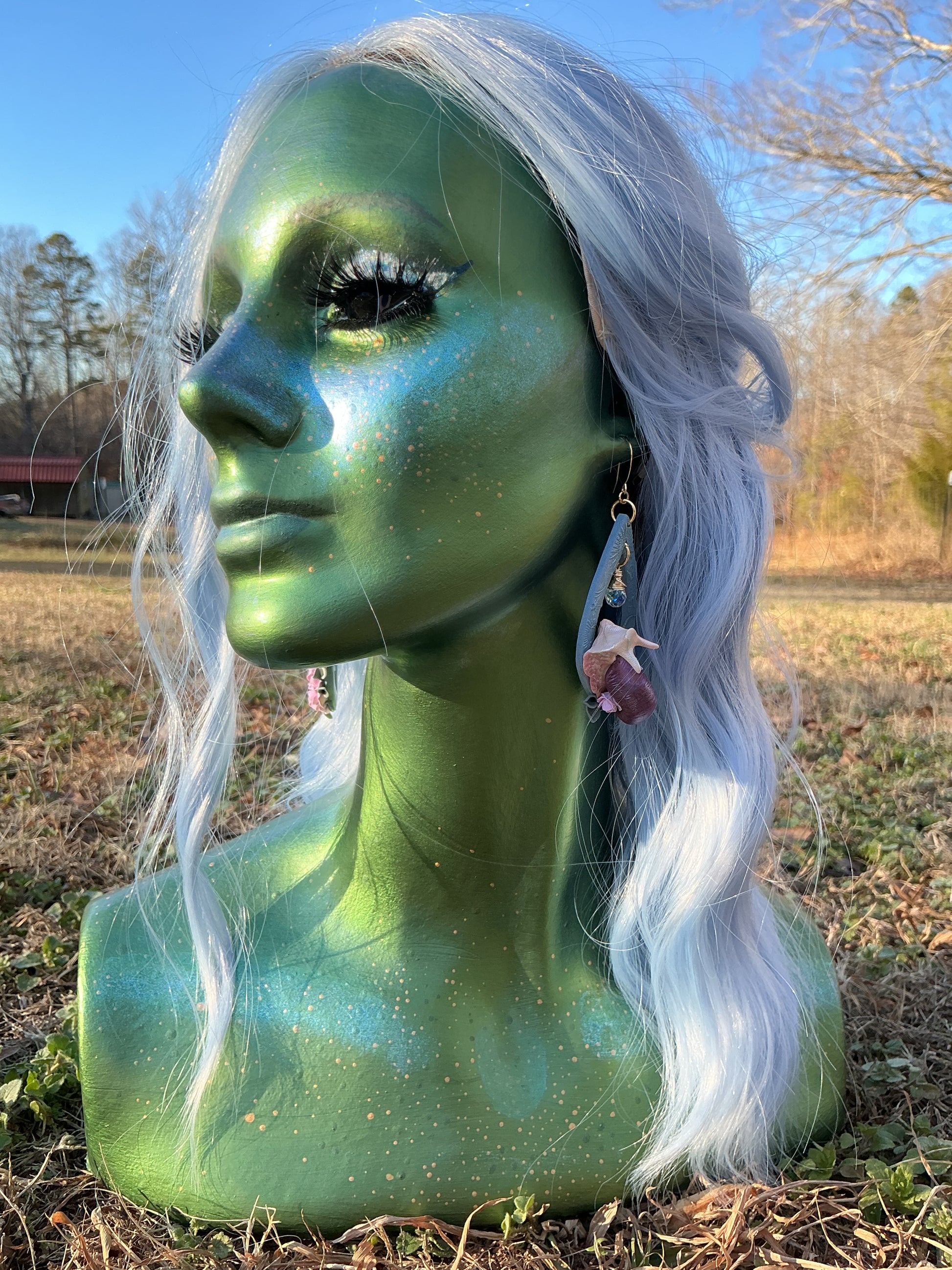 One of the CUTEST earrings I have EVER made! I hand sculpted a mini large snail to admire you (he even brought you roses!). Your little snail admirer is angled just so to silently admire you throughout the day. He thinks you’re the sweetest sweet potato he has ever laid eyes on! Everything is hand sculpted out of polymer clay and hand painted. The glittery sparkly bits are faceted glass beads sourced from a local woman owned small business.