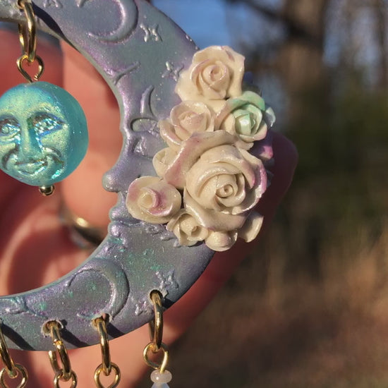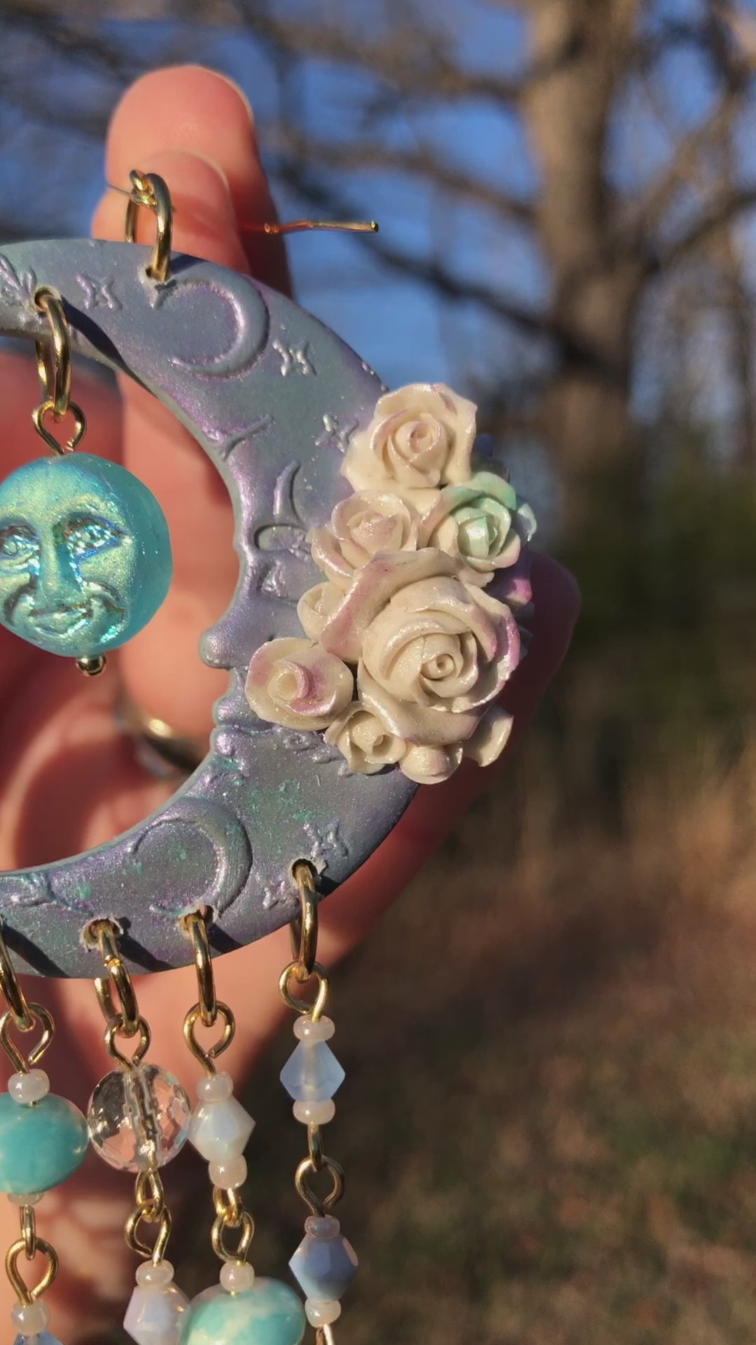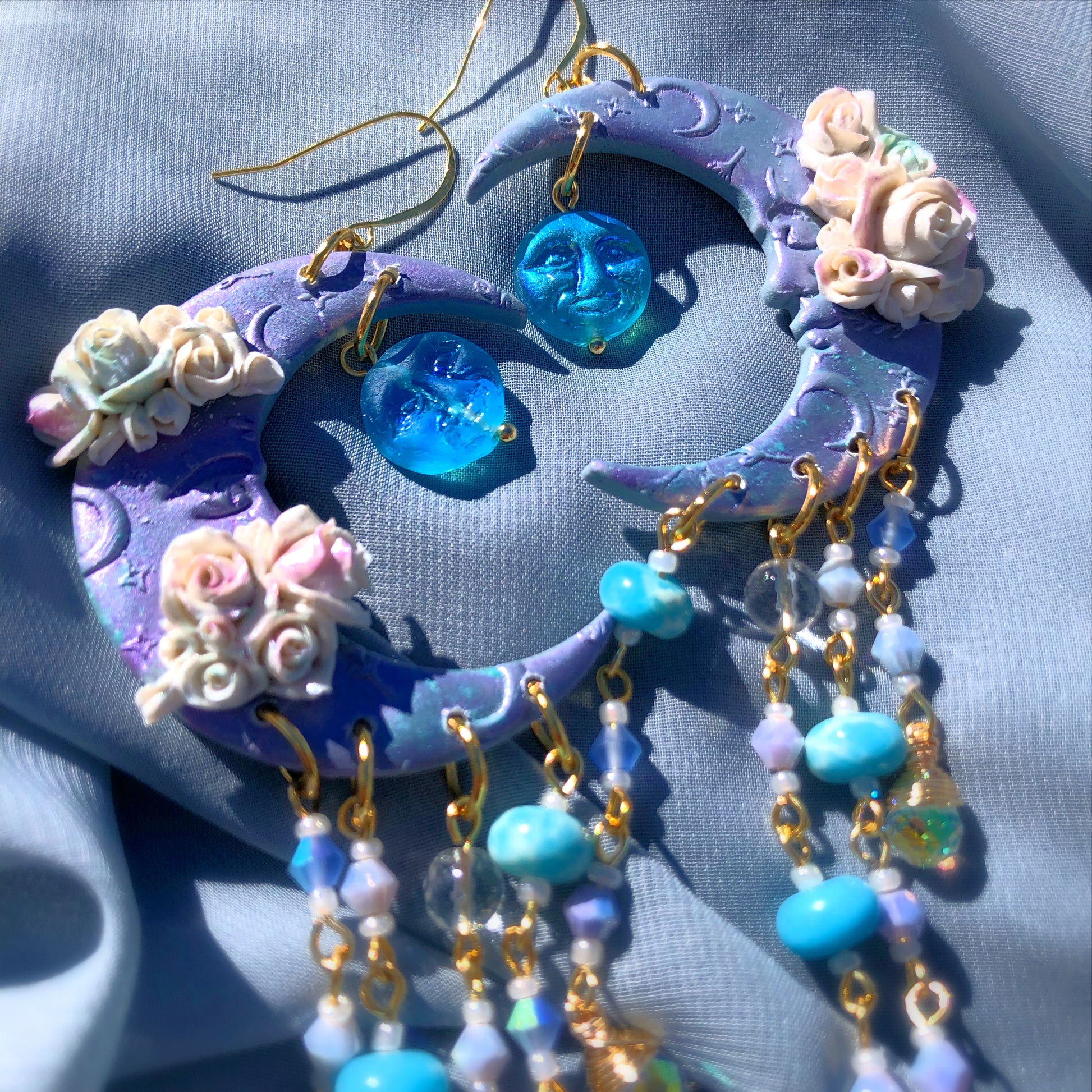 Inspired by the longer days where the sky is still blue but the moon peaks through. Made from high quality faceted glass beads and dyed blue jade that has white features to mimic the cloudy sky. Handmade petal by petal, then hand painted. Czech glass moon bead.