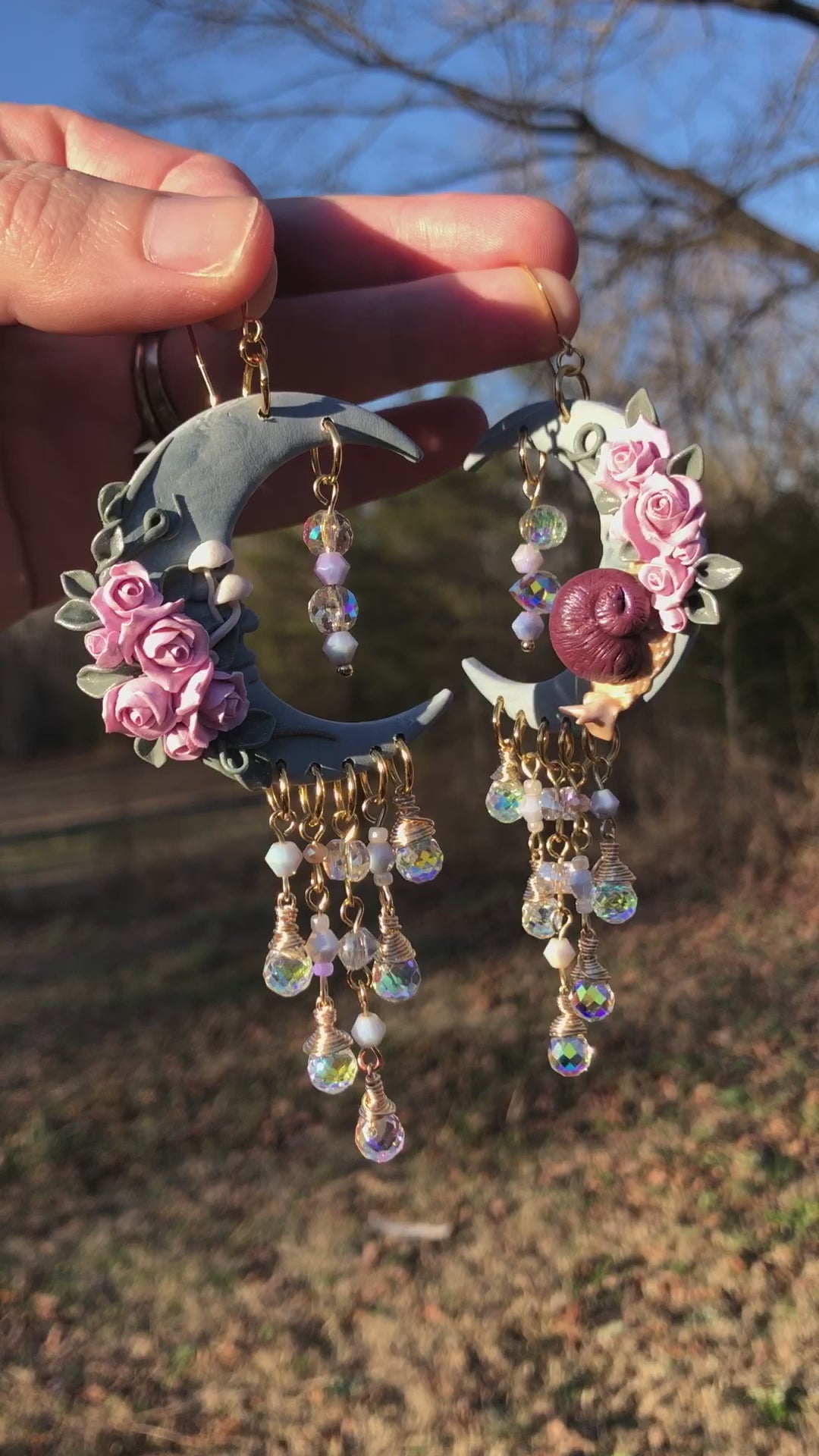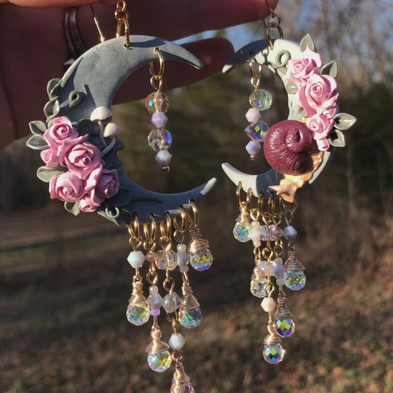 Marbled teal and white matte moons with pink roses & vines and a tiny snail scooting down to check out the shimmer of high quality faceted glass beads beneath. You will absolutely light up the room with the shimmer of these, even though you didn’t need that help anyway ;)