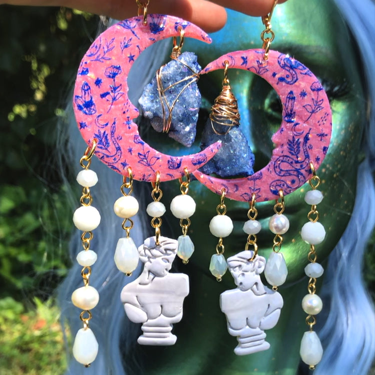 Iridescent opal effect pink moons with blue witchy patterns. Polymer clay Greek state, real freshwater pearls, and various glass beads.