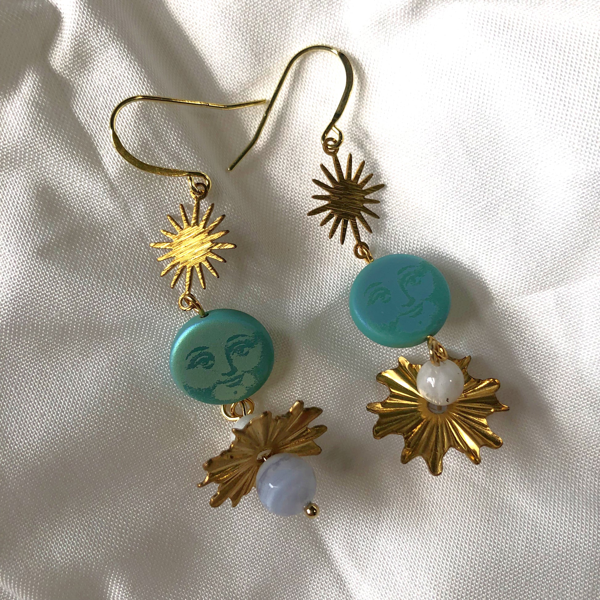 Whimsigothic and vintage inspired dangles that are lightweight to average statement earrings. Features matte glass beads that are reversible (other side has crescent moon), and vintage brass sunburst charms between moonstone and faceted blue agate. Brass textured Sun charms, and gold plated sterling silver hooks.