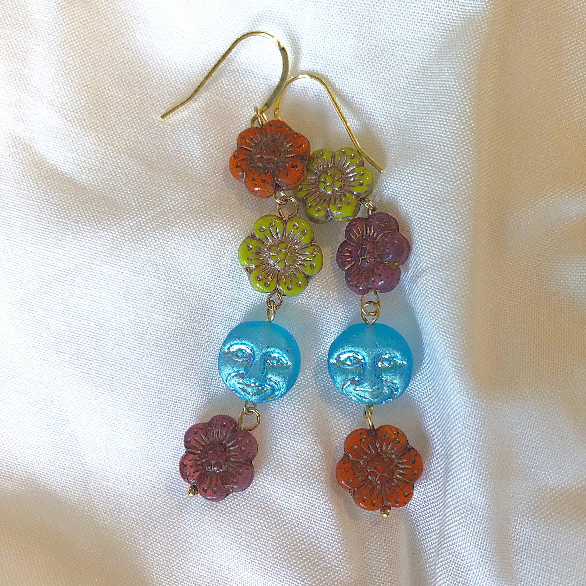 Lightweight dangle statement earrings that include all Czech glass beads. Blue moon has iridescent finish. Gold plated sterling silver hooks. 💖