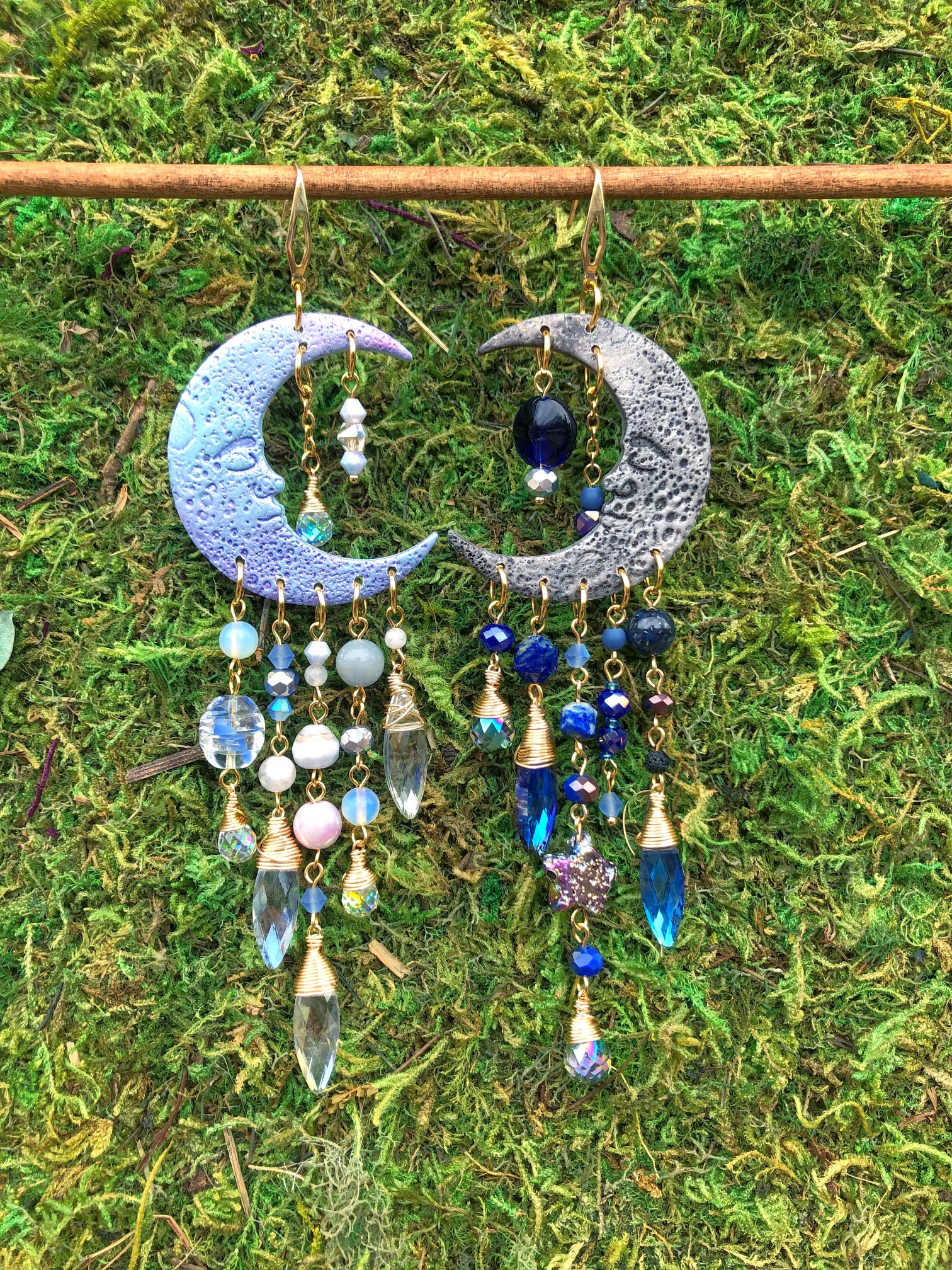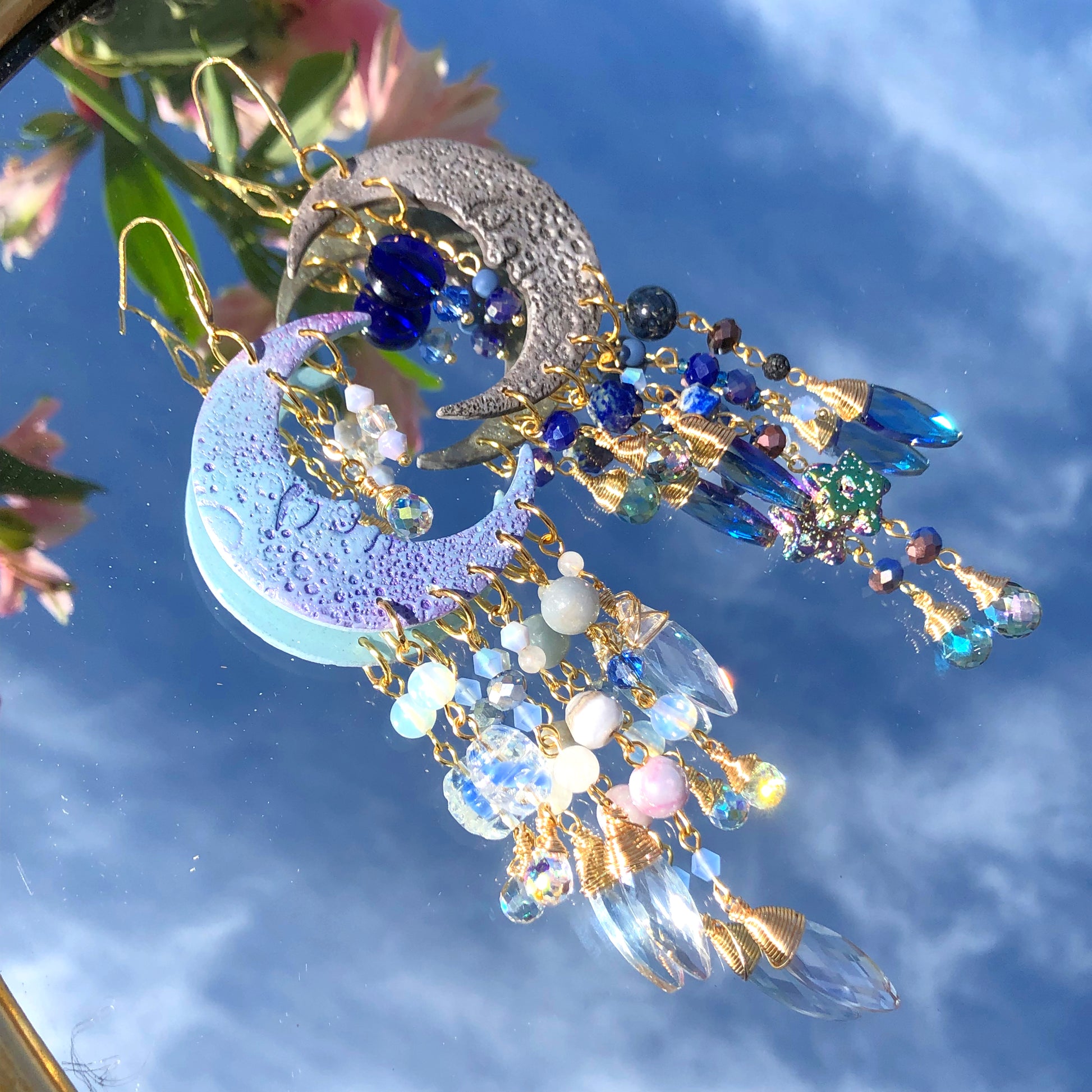 Two sides of the same moon, each unique but united. A periwinkle blue moon with various glass beads and semi-precious crystals (Angelite, Moonstone, Blue Lace Agate) to represent warm evenings when the moon can be seen through a beautiful blue sky. A gray moon represents the moon at night, with stars, deep blues, and dark twinkles. The gray moon features Lapis Lazuli and faceted glass beads. Both moons have faceted glass that has been wire wrapped in tarnish resistant gold wire.