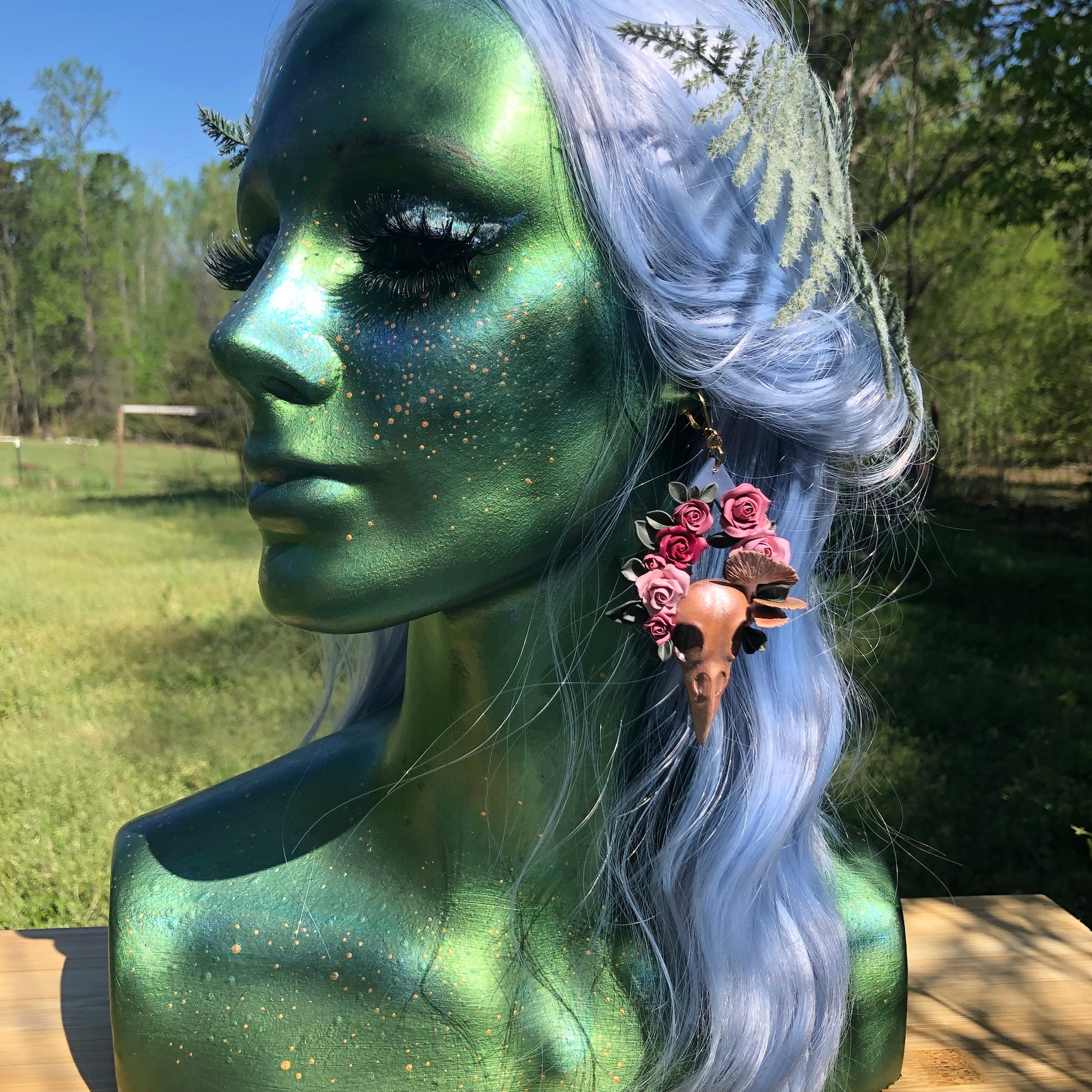 Made entirely out of polymer clay! Flowers are hand sculpted petal by petal, raven skulls are made from a mold that are then hand painted and shaded by Mable. Gold plated stainless steel lever back earrings.