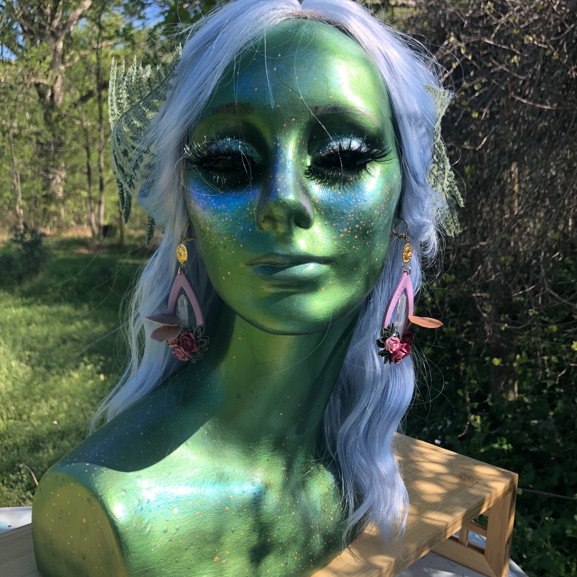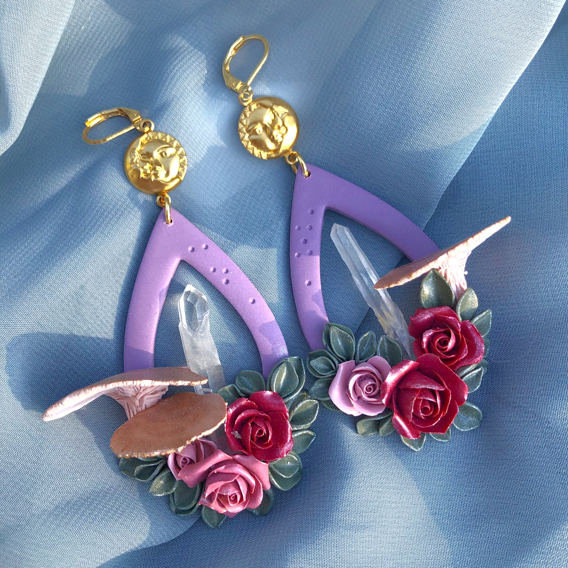 Each flower is sculpted petal by petal, each snake and mushroom are unique and made/textured by hand. Gold plated stainless steel lever back earrings. Brass sun & moon charms.