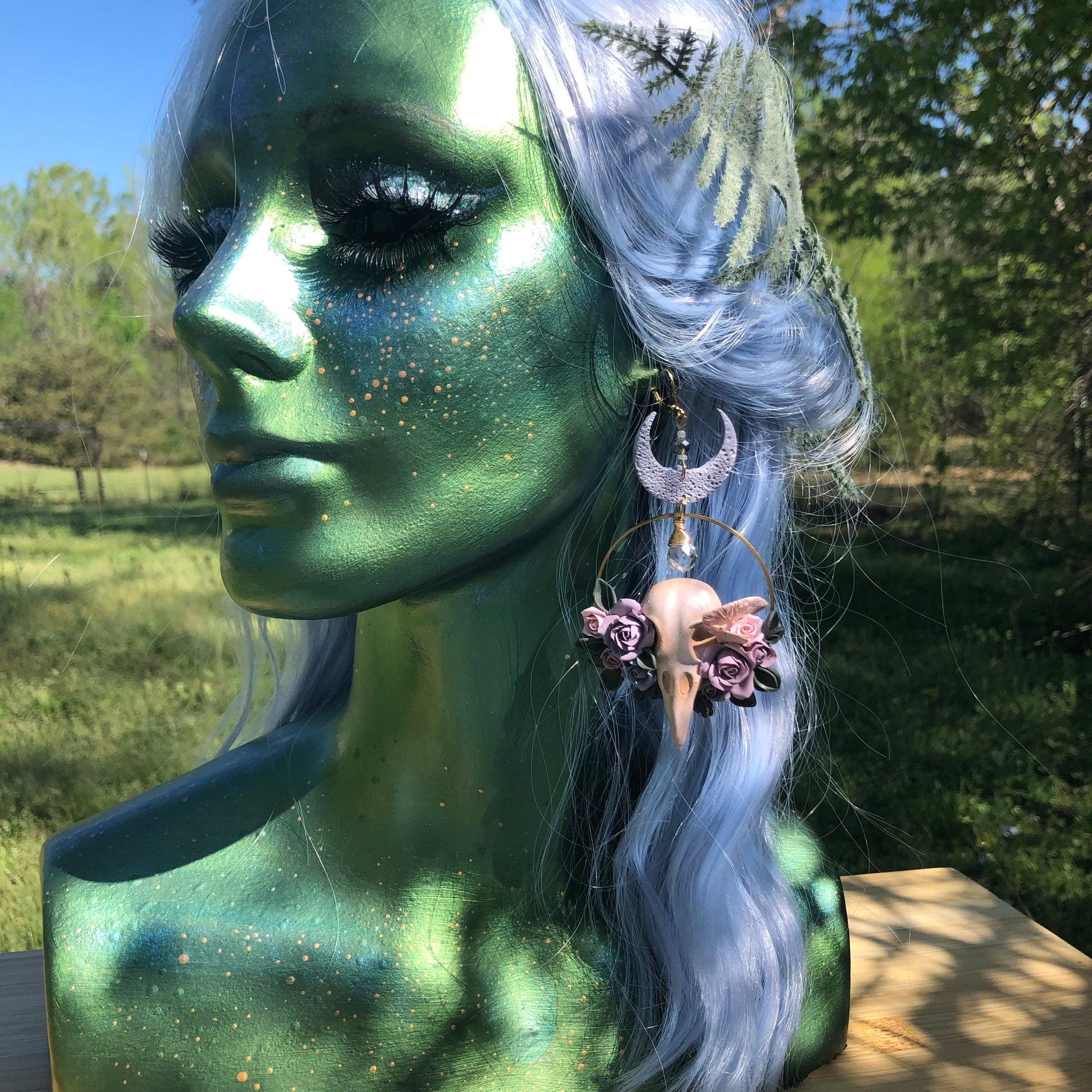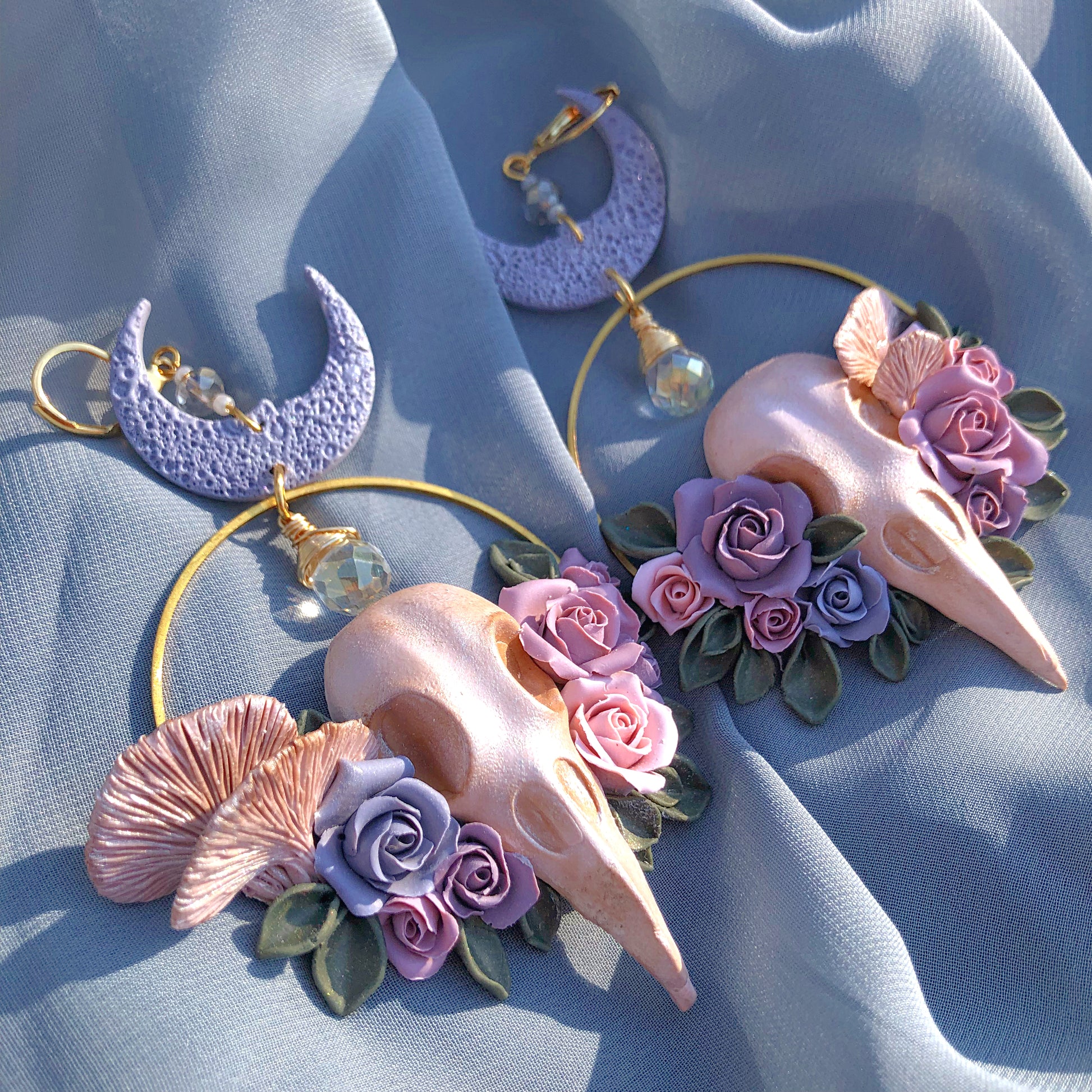 Each flower is sculpted petal by petal, each skull is made from a mold which is then shaded and painted on by Mable. Brass hoops, gold plated stainless steel lever back earrings.
