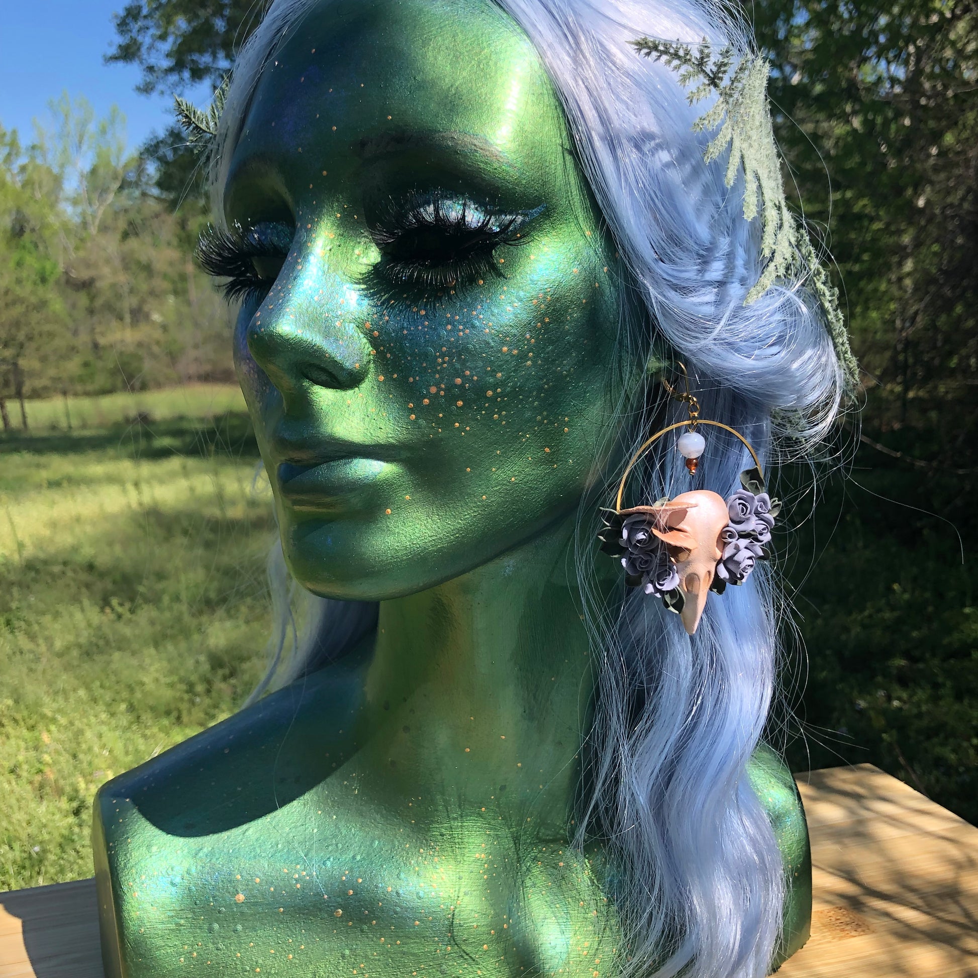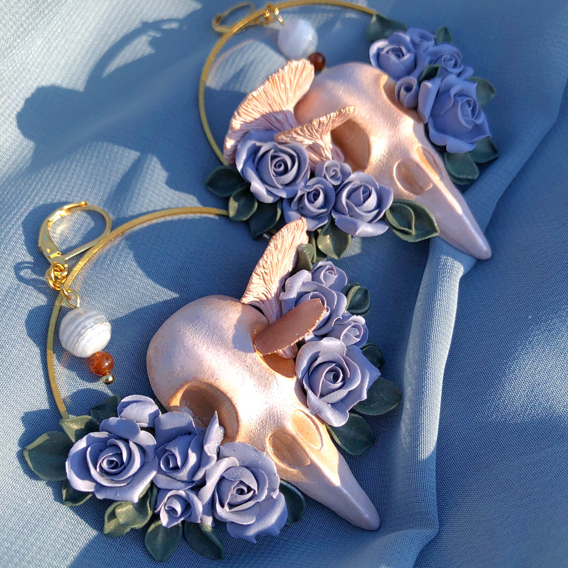 Each flower is sculpted petal by petal, each skull is made from a mold which is then shaded and painted on by Mable. Brass hoops, gold plated stainless steel lever back earrings.