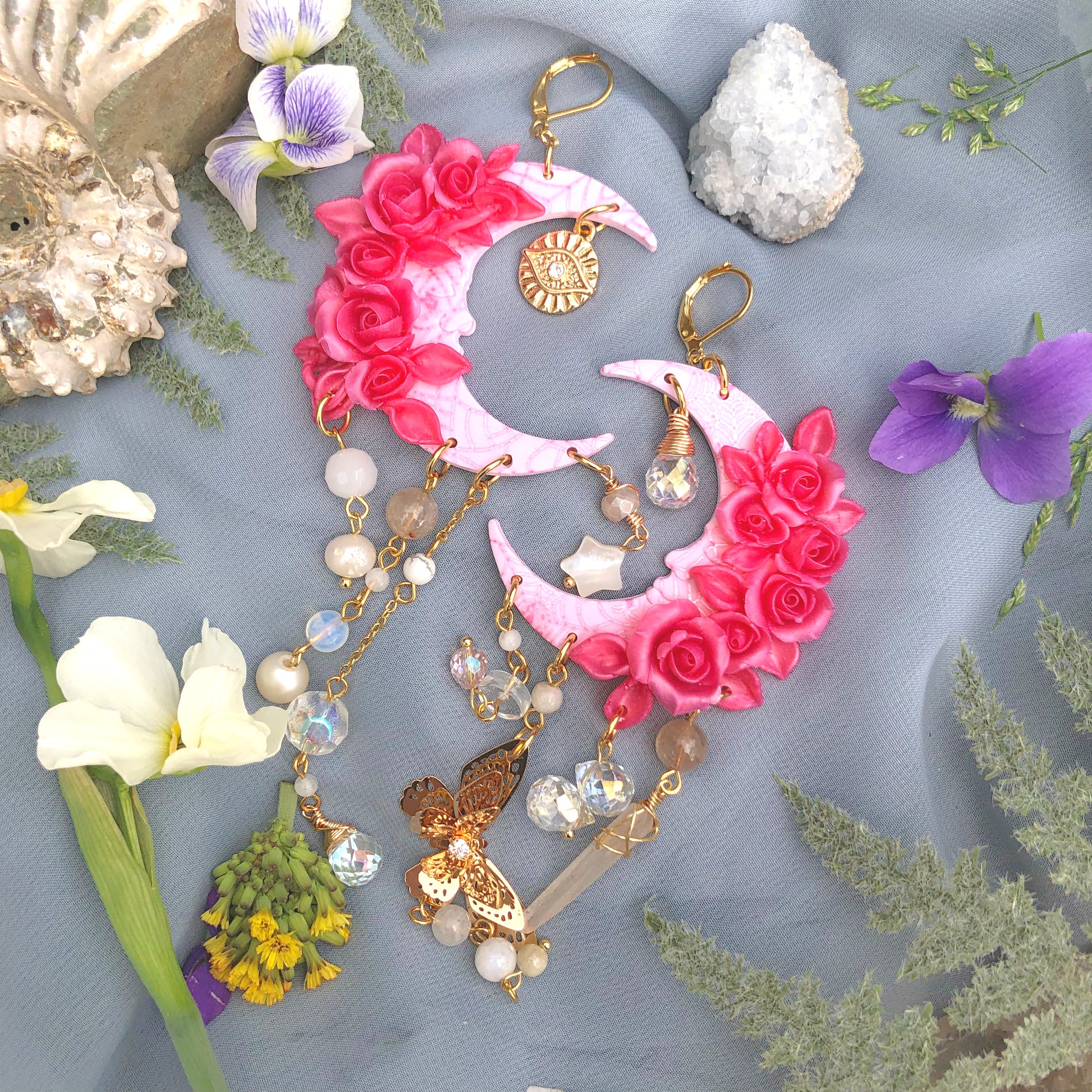 Handmade polymer clay moon & flowers, screen printed with a web design. Dangles include strawberry Quartz, real freshwater pearls, faceted glass beads. Gold plated butterfly and gold plated evil eye charms.