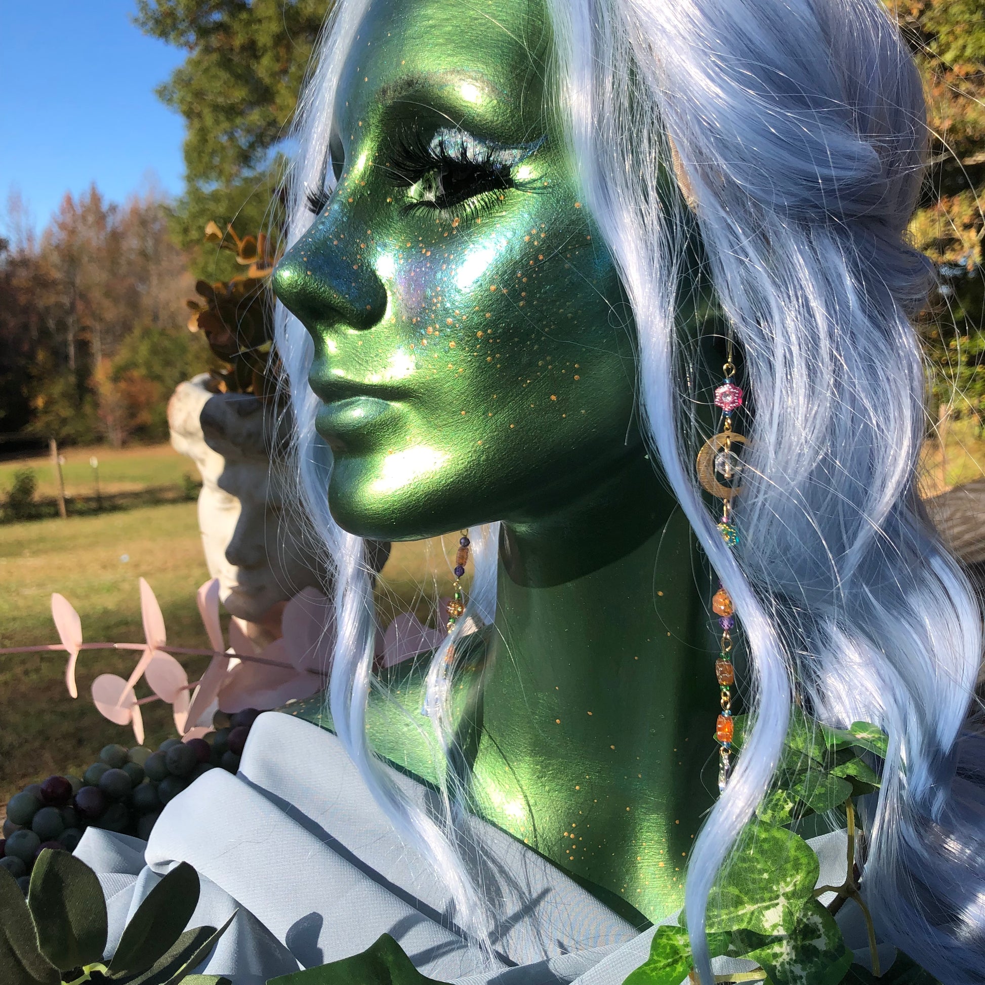 Mixed metal lovers rejoice! I’ve been feeling the mixed metals lately. Gold plated sterling silver hooks, textured brass moon, plastic star beads that have gold and silver detailing, purple cubic zircon beads, glass seed beads, faceted clear quartz beads, and silver plated brass moon tarot cards. Suuuuuuper lightweight!