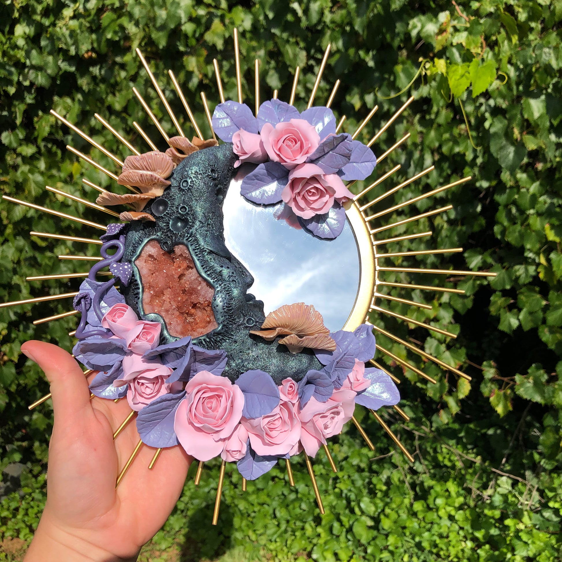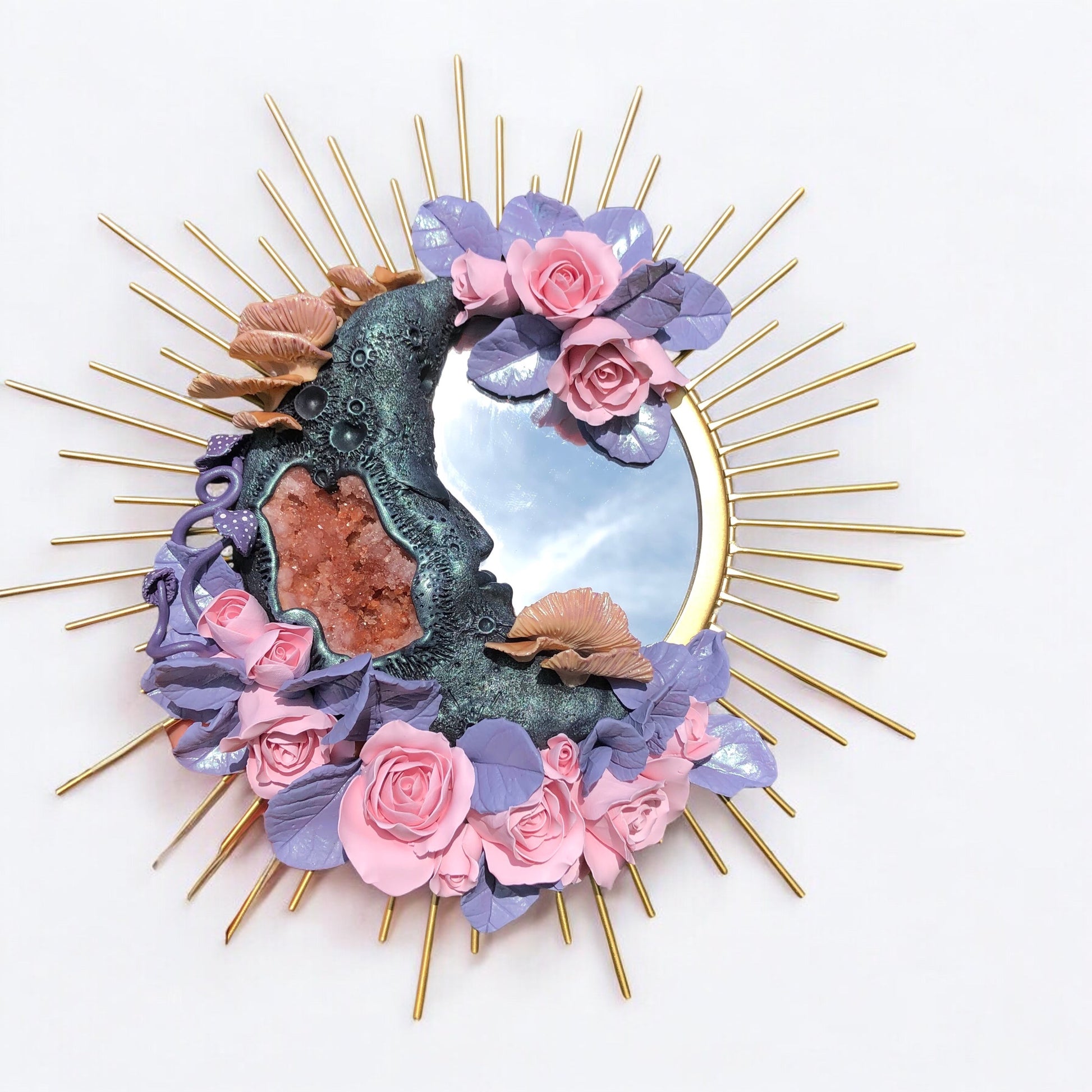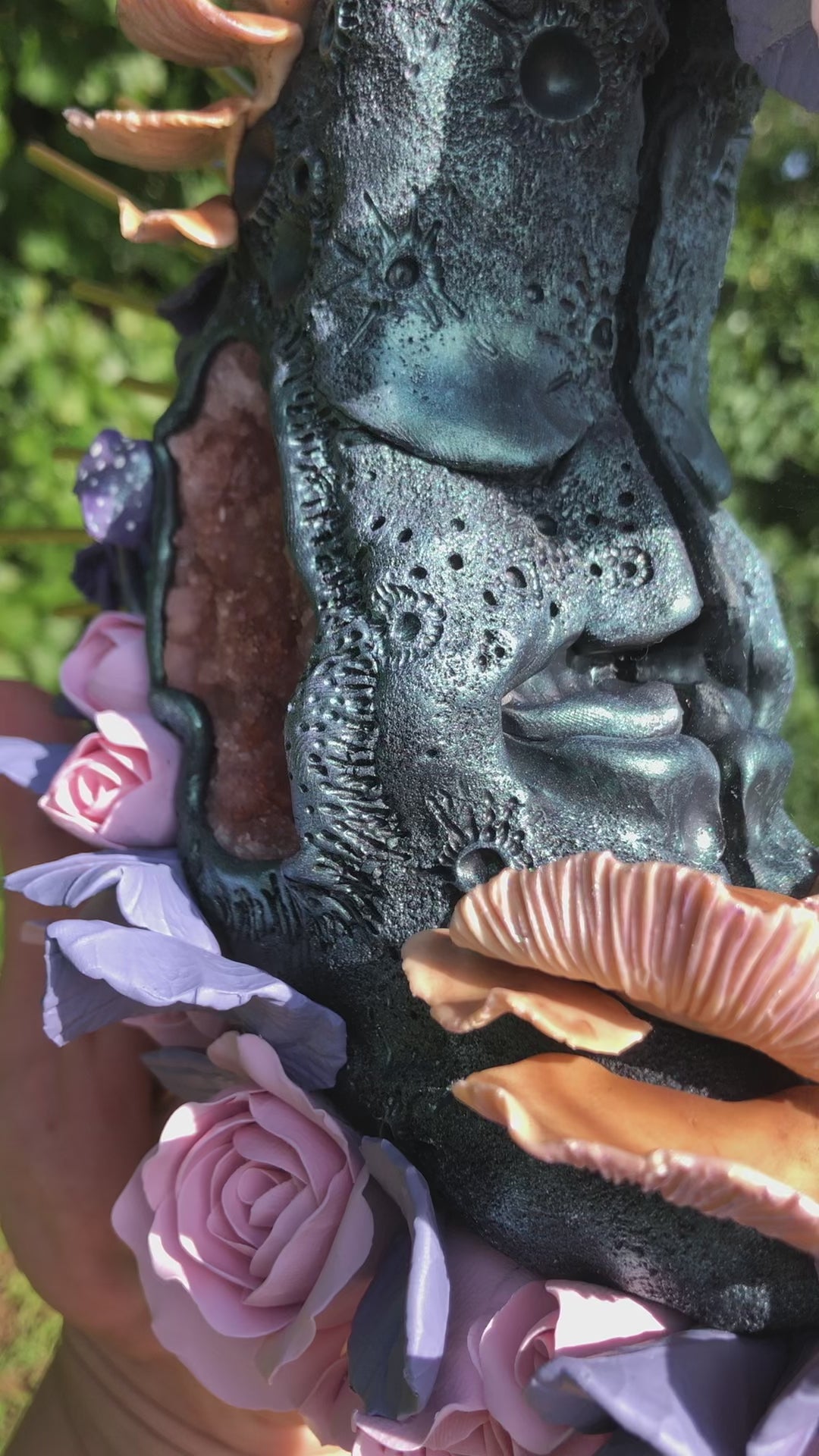 CraterFace Calliope- serene, peaceful, full of sass when she wakes up, and hums the most beautiful sounds you have ever heard (hence her name💜). Loves strawberry shortcake and raspberry gelato. 💕 Calliope is covered in shimmering space dust and is growing a pink amethyst. Pink amethyst is known to make your heart and soul feel lighter by alleviating stress and anxieties. It’s nicknamed the “master healing crystal”.