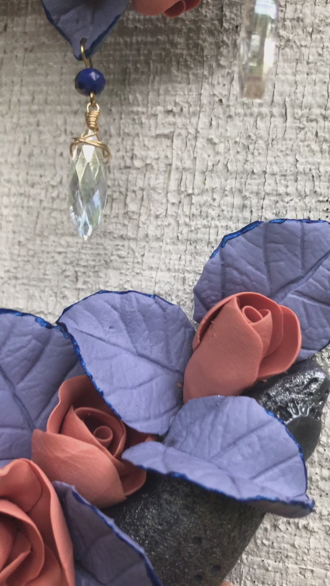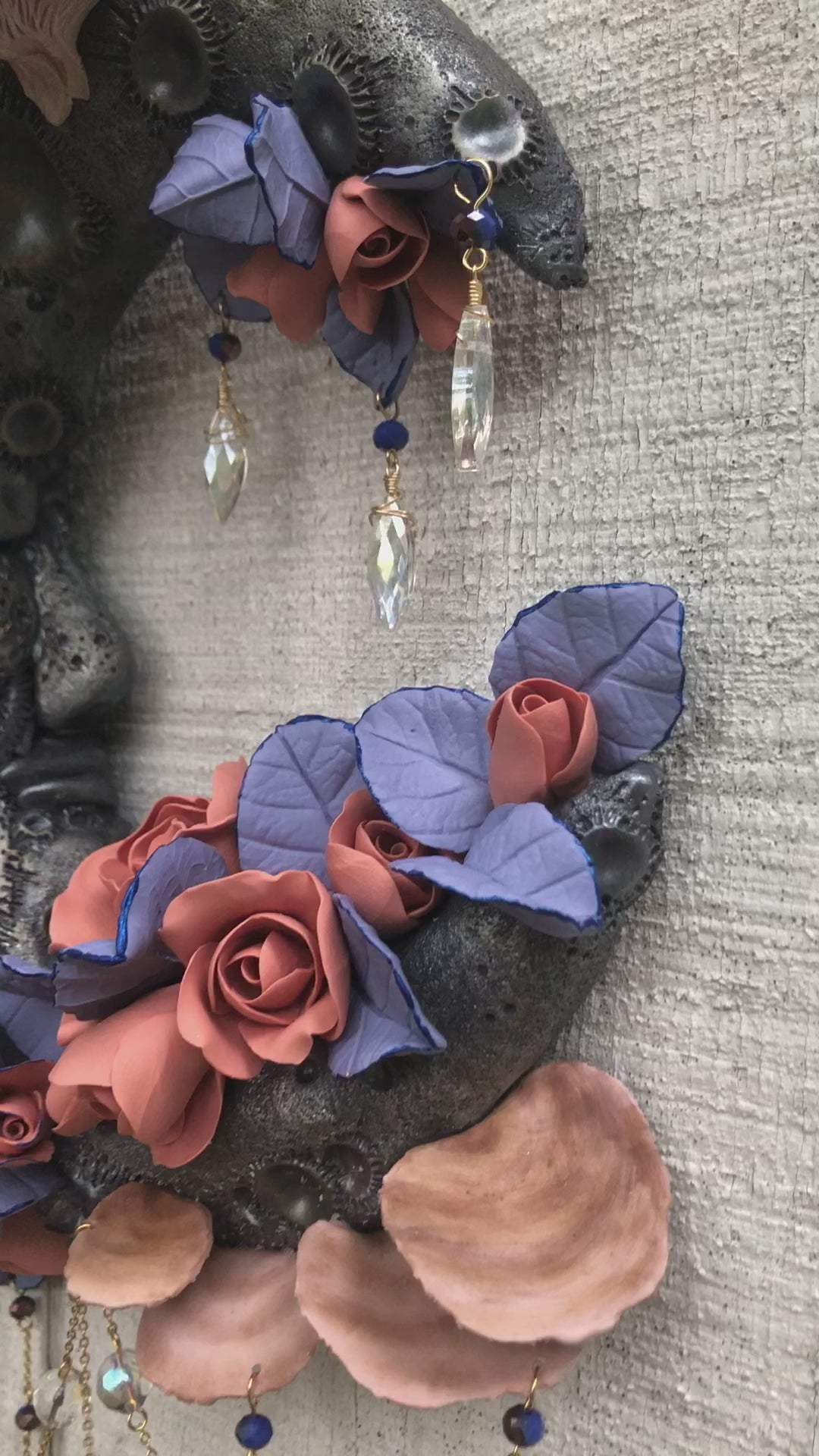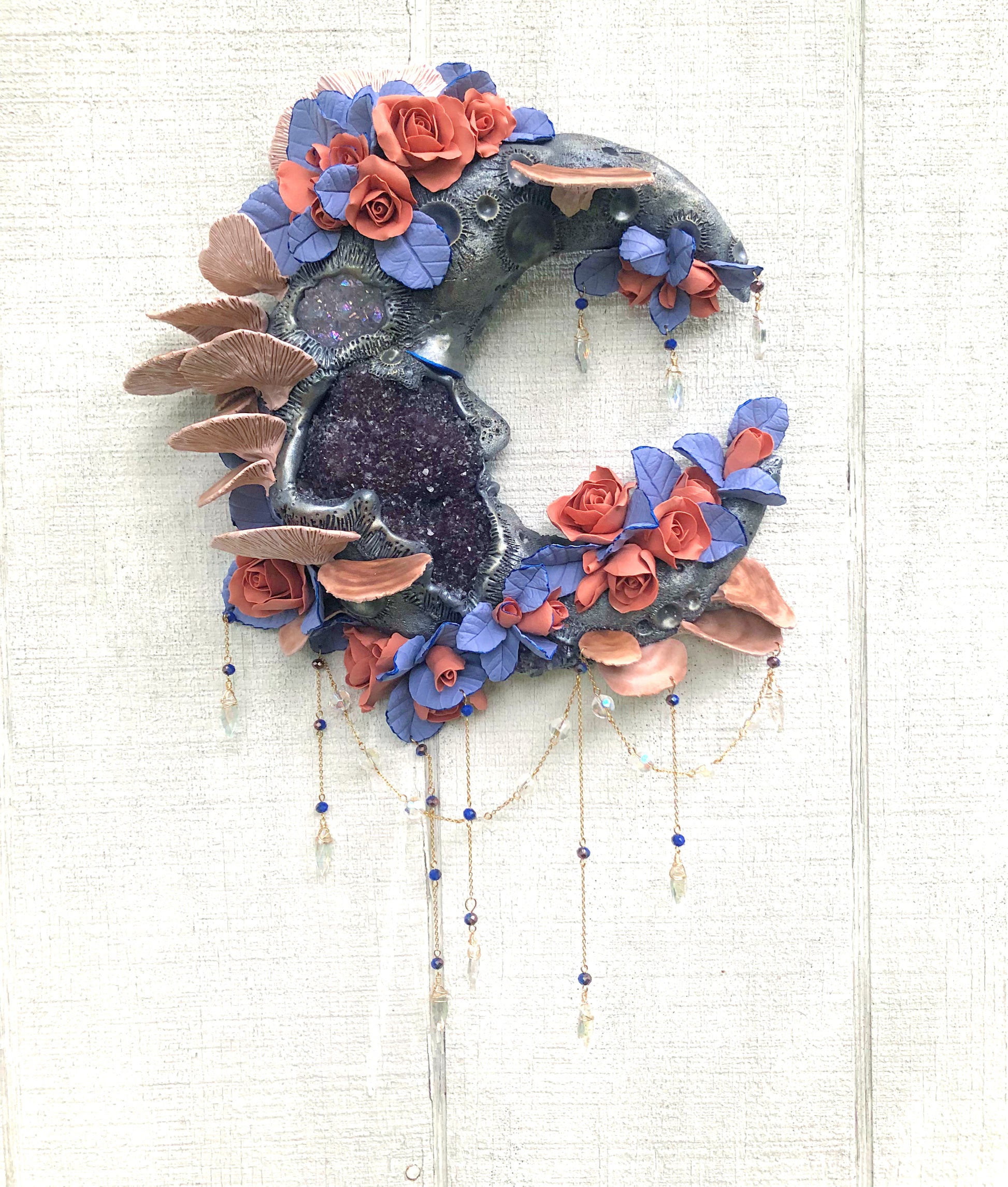 Meet CraterFace Collette! Collette means “victory of the people”. This sugary sweetheart grows a delicious sugary grape amethyst cluster and Angel amethyst cluster. ❤️ She wears cobalt blue eyeliner with cobalt blue edging on her leaves and some of her roses. Her roses are a peachy orange color. Everything is handmade by hand. ❤️