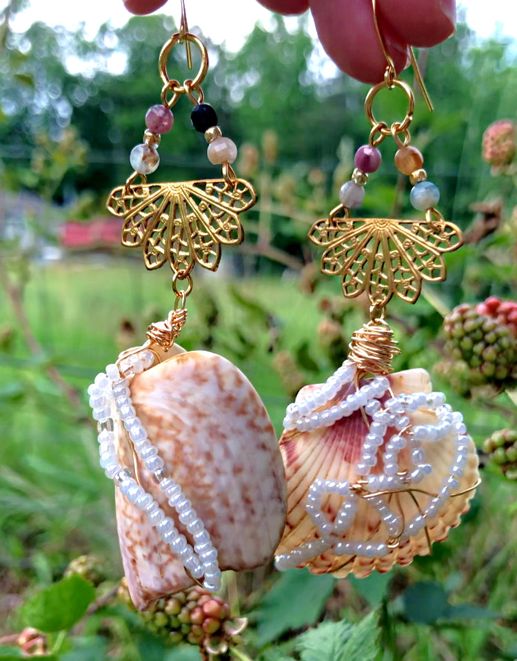 Earring weight is average if you’re used to statement earrings because I couldn’t get some extra shells out of the back of the left shell- so I discounted $5 because of aesthetics (only in the back haha). They are wire wrapped with tarnish resistant gold wire. The filigree is brass. Tourmaline is on gold plated stainless steel hardware and earrings are gold plated sterling silver.
