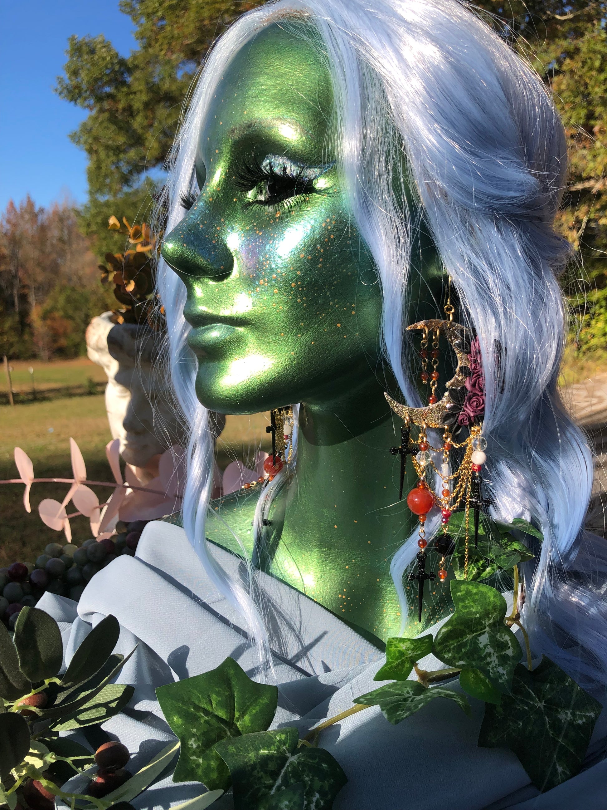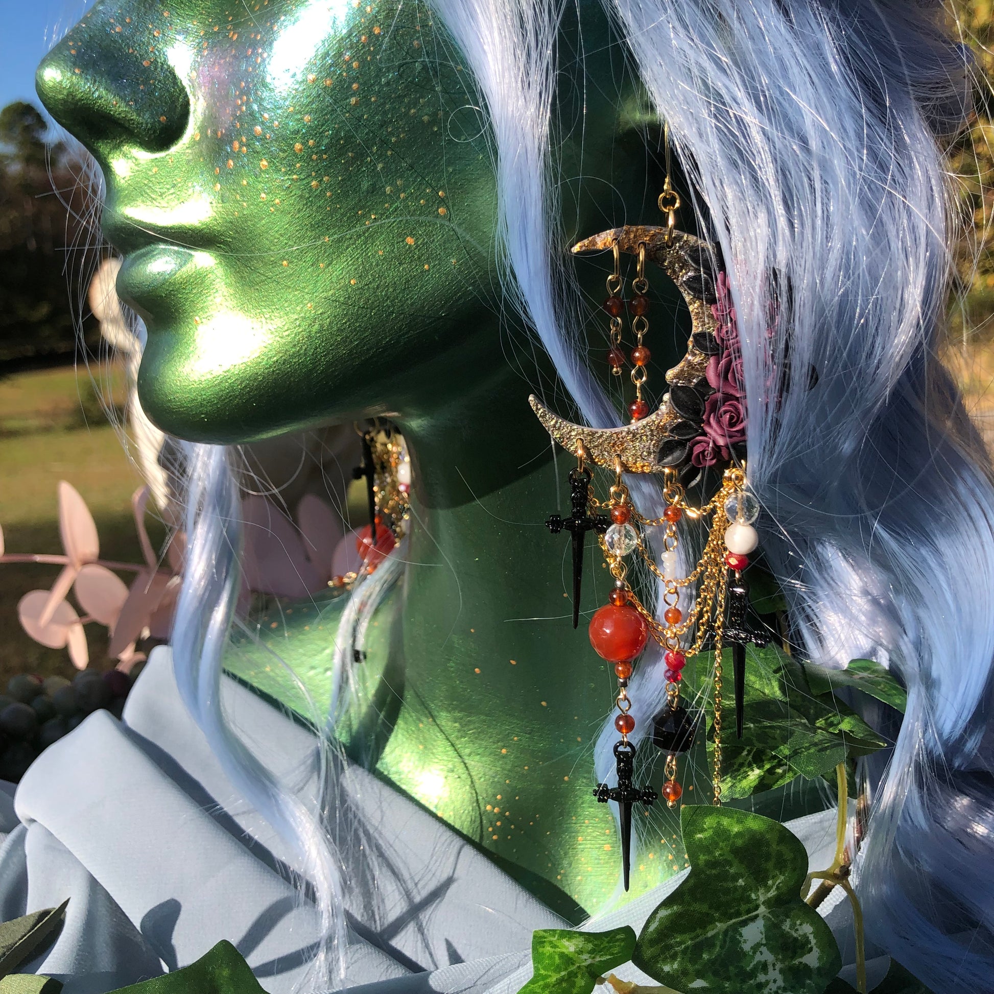 Carnelian & Hessionite Garnet as an ode to Maria’s beautiful red hair. Faceted clear & Smokey quartz beads that represent the jewels under her eyes. I made the dangles slightly mismatched and uneven for more fun and interest like Maria herself. 🖤 I also sculpted a white moth to represent her transformation. 🖤