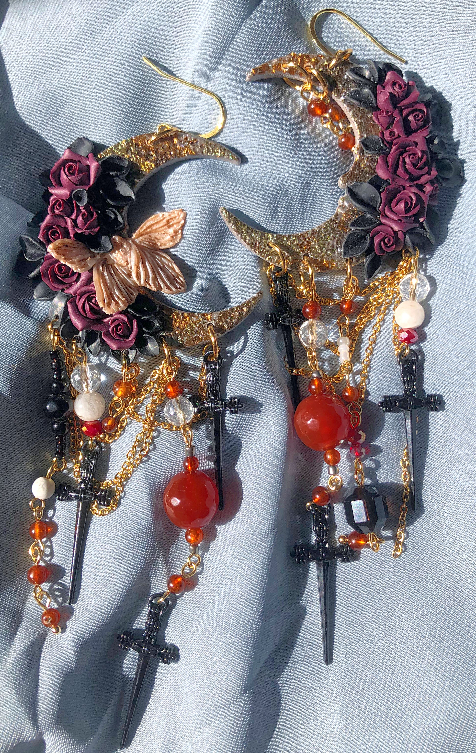 Gold plated sterling silver hooks. Unknown metal black single sided black swords/daggers. Polymer clay moon, polymer clay roses and moth sculpted by hand. Moon is encased in jewelry grade resin.