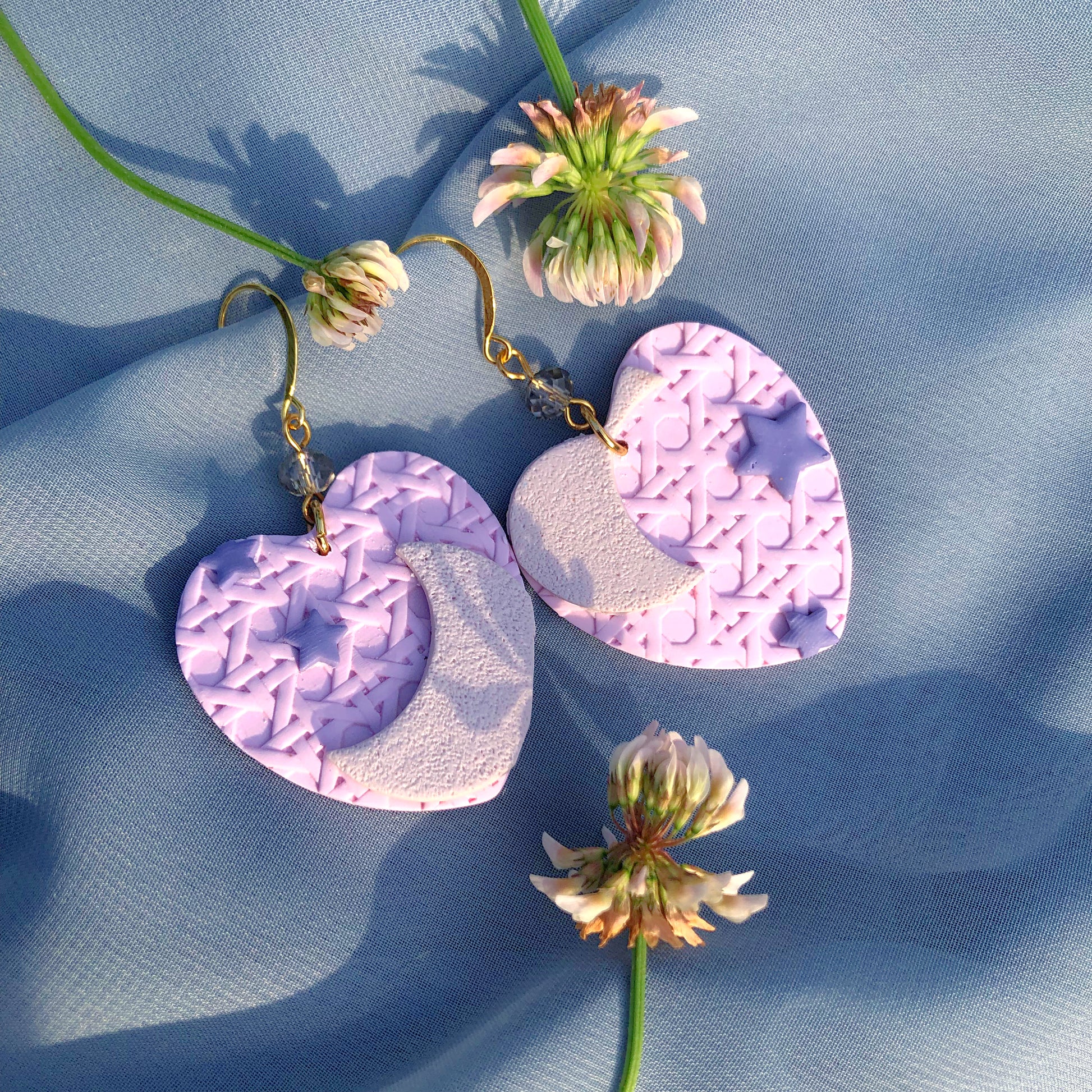 Gold plated sterling silver hooks, polymer clay hearts with stars and textured moons.