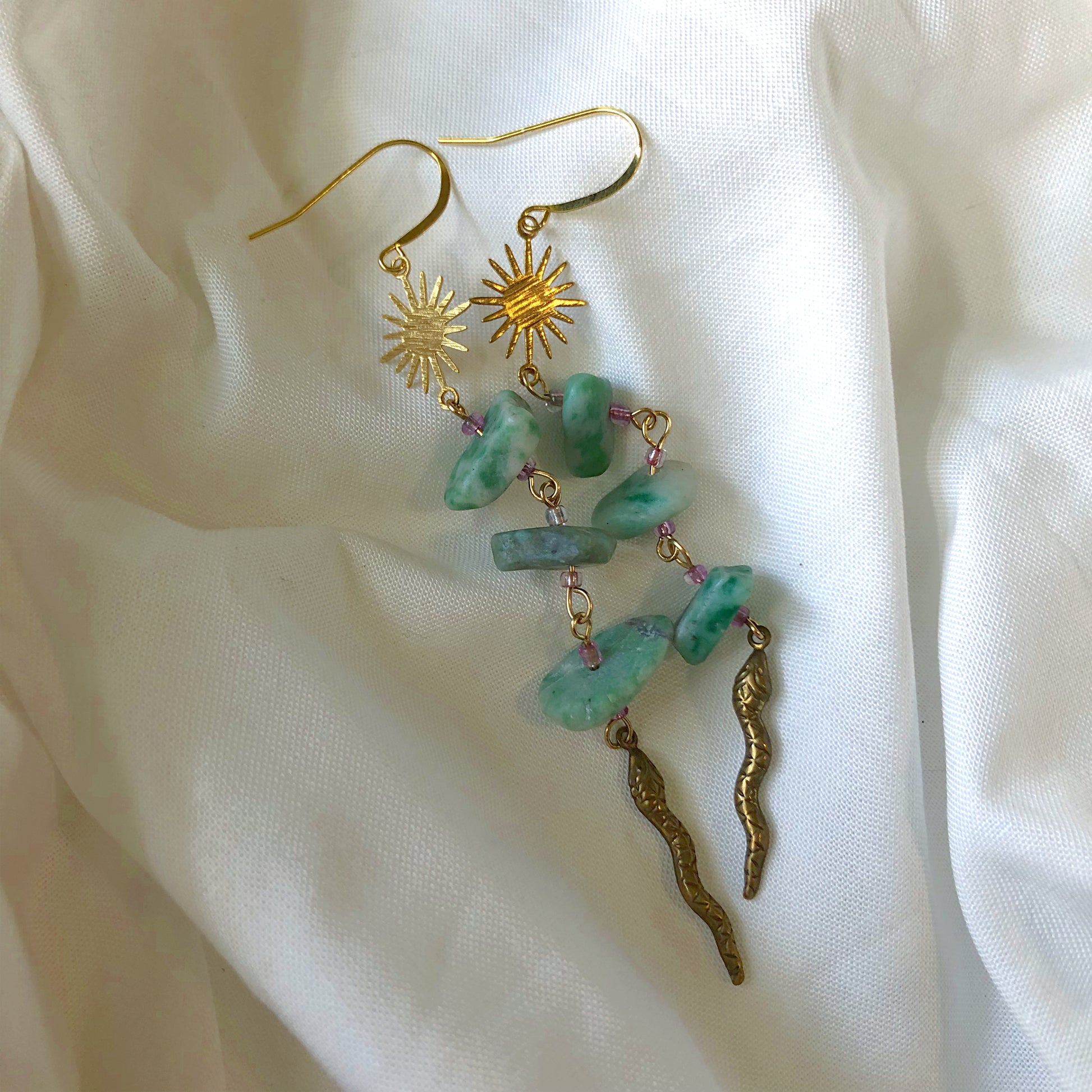 Lightweight earrings | Unknown crystal chips | Pink glass beads | Brass suns & snakes | Gold plated sterling silver hooks