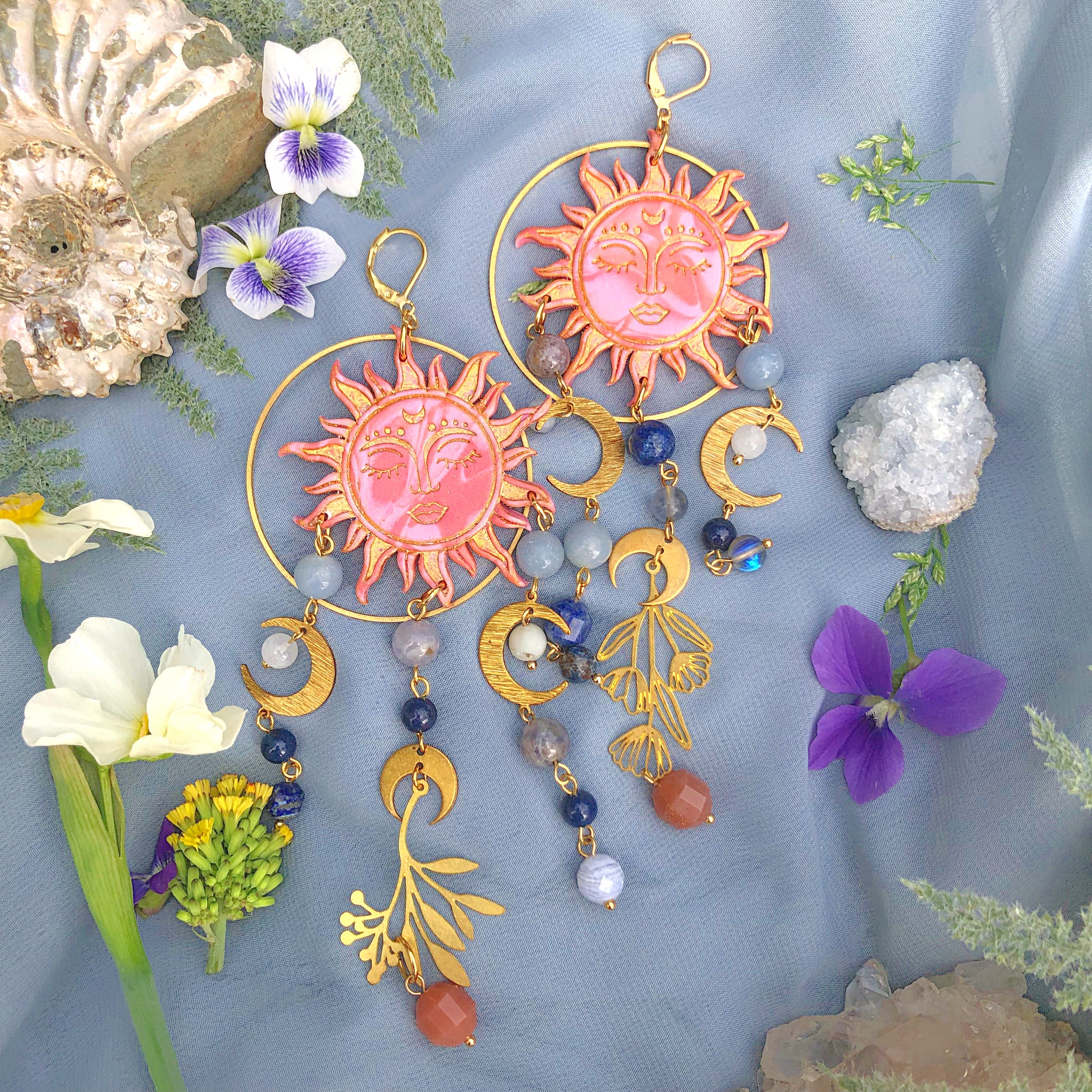 Angelite, sunstone, iolite, moonstone, and blue dyed jade crystals. Brass hoops, moons, and botanical charms. Gold plated stainless steel clasp. ❤️ Polymer clay suns handmade and hand painted by Mable.